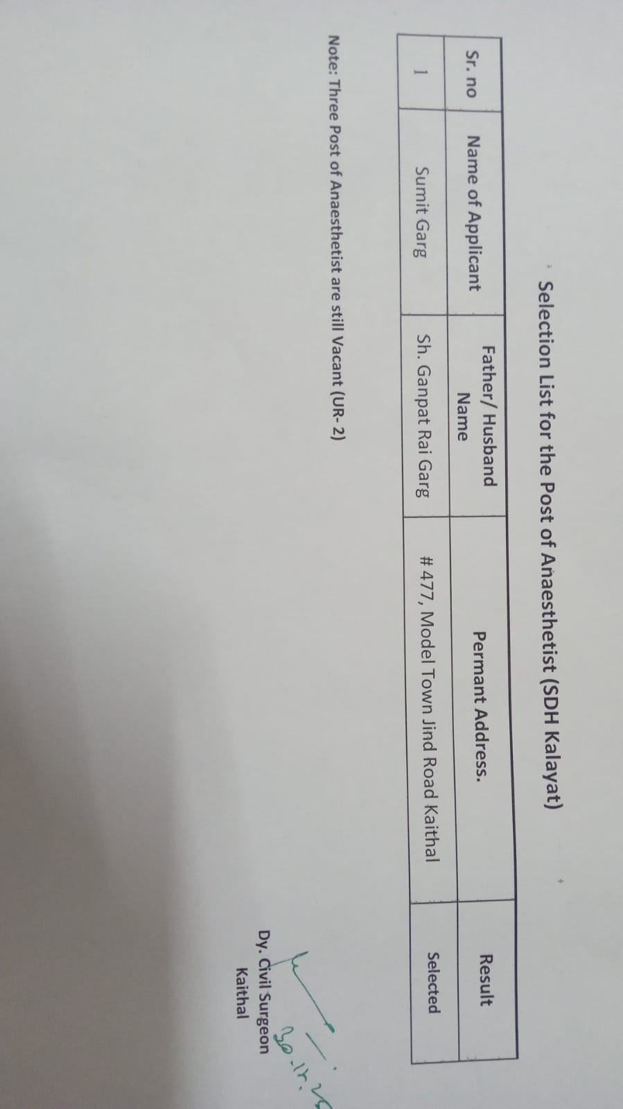 Selection list for the post of Anaesthetist at SDH Kalayat